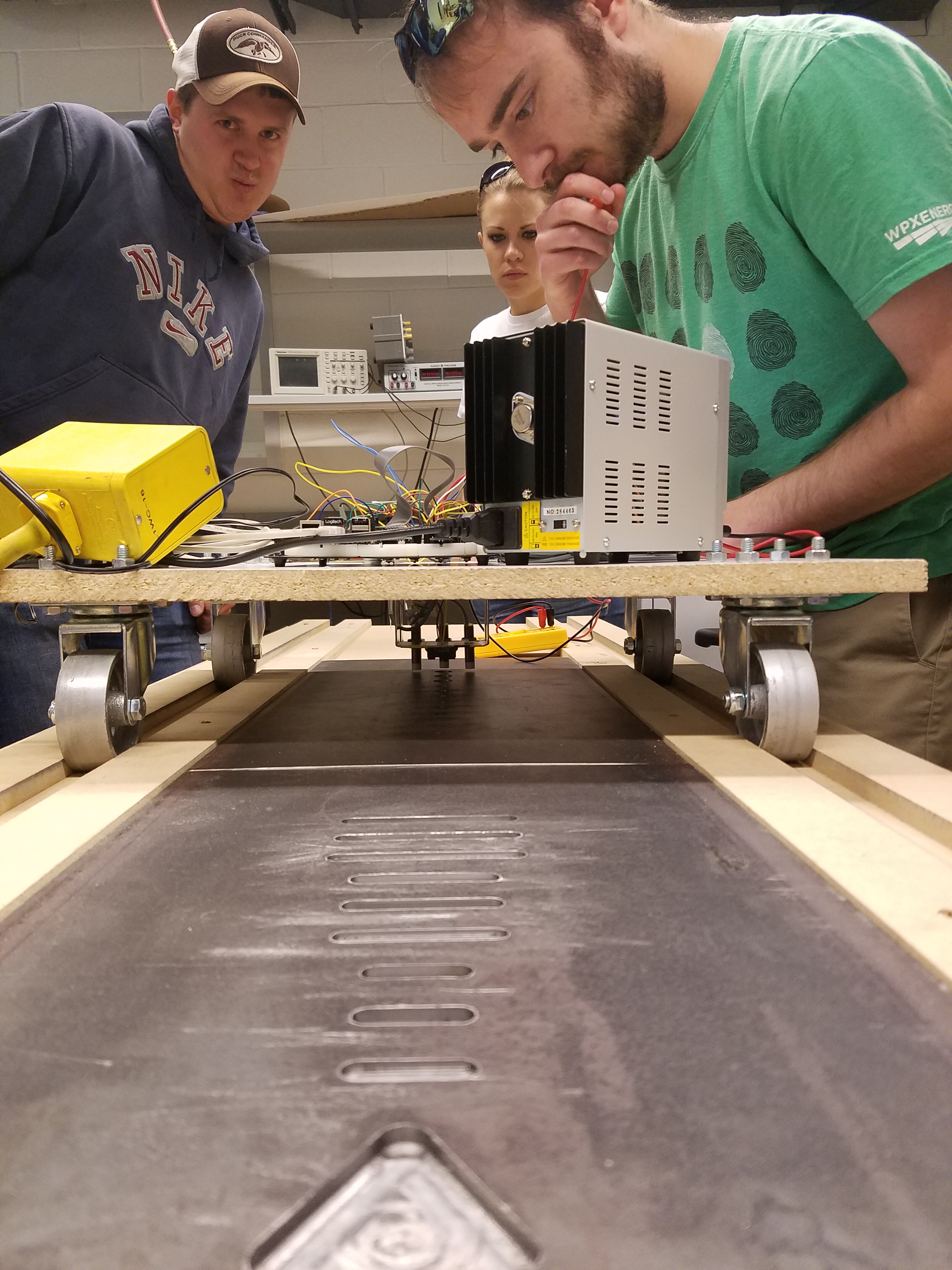 Testing involved rolling the cart along the track. As the cart moves, the electronics record a voltage signal from the sensors. These sensor voltages correspond to the distance between the sensor tip and the steel target. Voltage readings are sampled and stored according to the process described in part one.