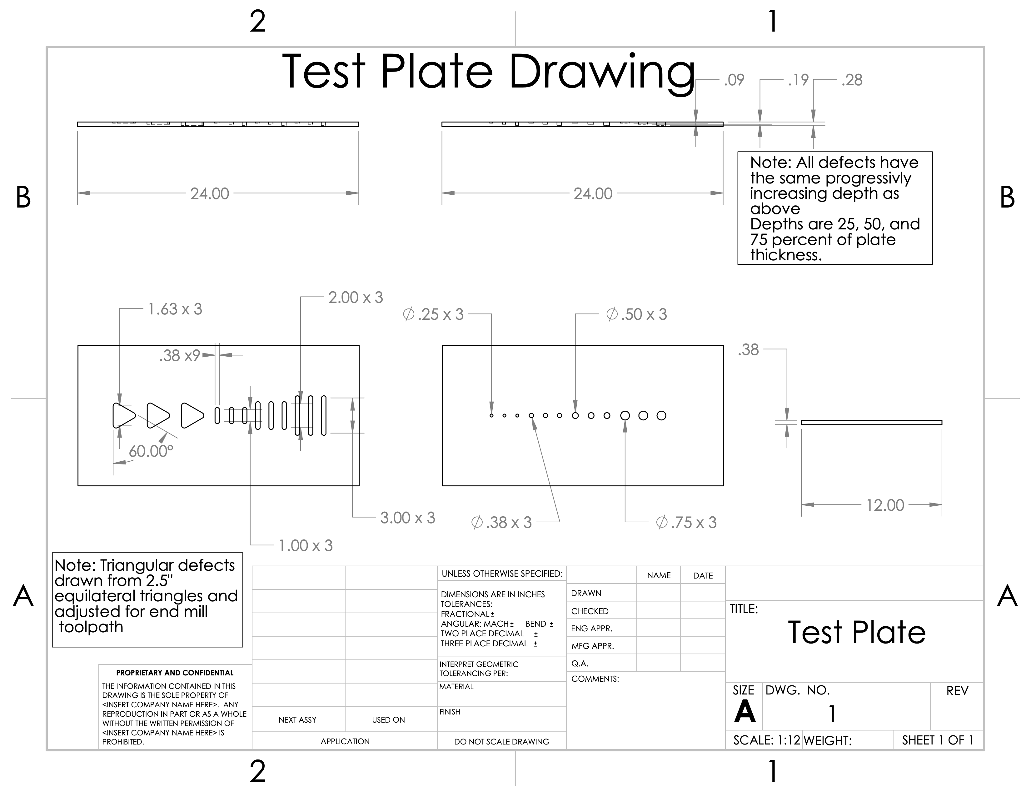Each target geometry was machined to 25%, 50%, and 75% of the wall thickness. For the 9.5 mm (3/8 in) plates, these depths are 2.4 mm (0.09 in), 4.8 mm (0.19 in), and 7.1 mm (0.28 in). The targets were arranged axially in groups of three, one target of each shape at each of these depths.