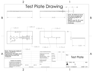 Figure 03 is a mechanical drawing of the two steel test plates. Each plate was 24 inches long by 12 inches wide by 3/8-inch thick. These two plates contained 24 target defects of various geometries: cylindrical holes, radial slots, and equilateral triangles.