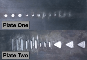 Plate Two contained slots and triangles. Slots were arranged in one-inch increments from one to three inches long. There were nine slots in total, one slot for each depth. These nine slots were followed by three 2.5-inch equilateral triangles, one at each depth. This arrangement tested the ability of the sensors to work together to report the shape of a defect.