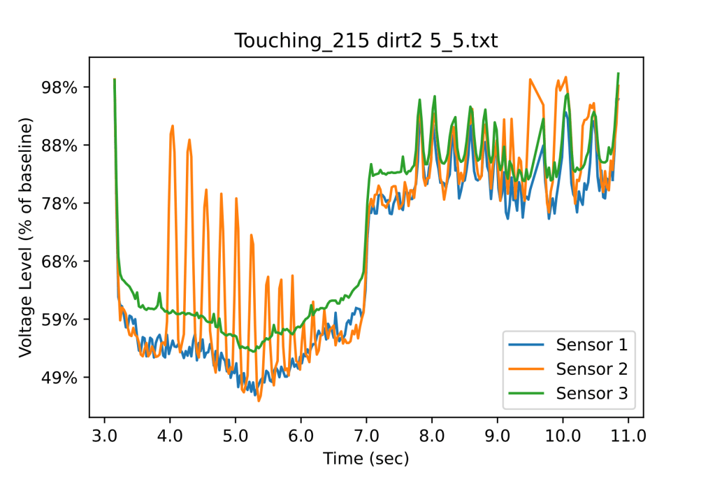 We tested the sensors’ performance when submerged in water, oil, or oily dirt. Figure 10 shows the sensor trace for the oily dirt. Here, the baseline is noisier because the sensors were moved very slowly, more than twice as slowly as in Figures 05 and 06. However, the results are functionally identical to those from the clean plates.