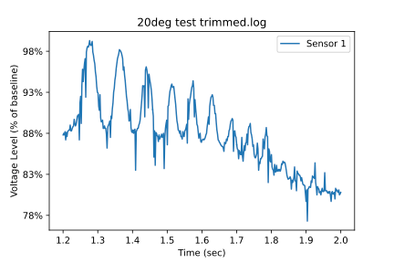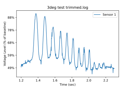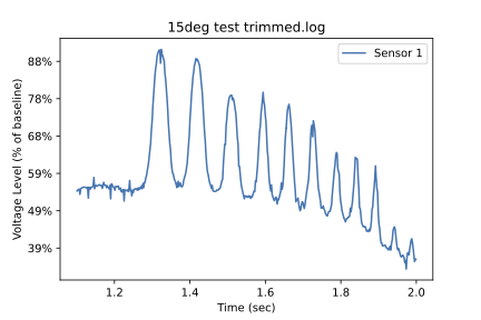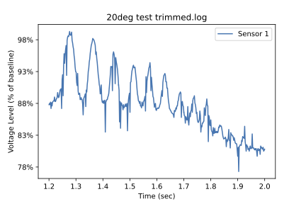 The angle of incidence captures the sensors’ ability to take meaningful readings while negotiating curves. We tested this by setting the horizontal spacing so the sensors were touching. The vertical standoff distance was set to 0.21 inches. We then ran a series of tests, increasing the sensors’ angle of incidence in small increments from vertical.