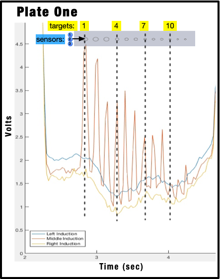 The spikes in the Middle Induction sensor curve correspond to the target holes.