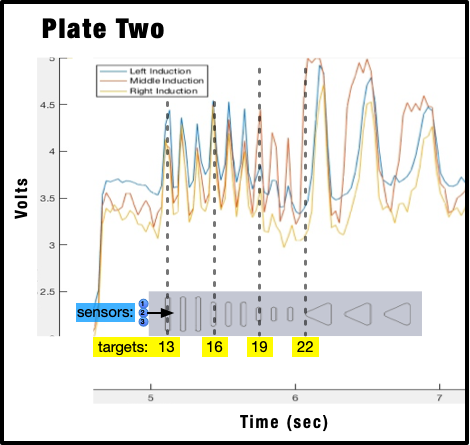 Consider now the signals from the three equilateral triangle targets, which are 2.5 inches (64 mm) on a side. Because these targets are so large relative to the sensor size, voltage signal differences due to the depth are visible for all sensor traces in this set. Further, the shape of these targets can be inferred for each set by noticing that the signal for the left and right sensors rise only when these sensors pass directly over the target.