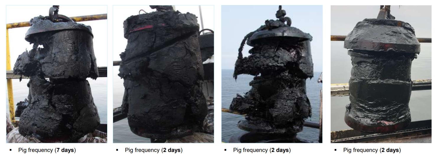 The standoff distance is the distance between the sensors and the pipe wall. A larger standoff distance allows the pig to handle dirty pipe walls, which is a critical concern for the target use case of this tool. Figure 05 from McNealy 2024 shows cleaning pigs from pipelines that are difficult to inspect because they are difficult to clean.