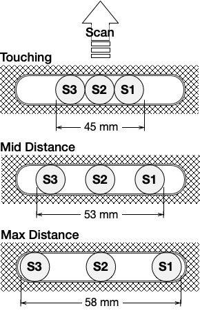 Recall that the sensors were 12 mm (0.47 in) in diameter. The smaller target holes were 9.5 mm (1/4 in) and 6.4 mm (3/8 in). If the sensing area is constrained to the space under the sensor, the center sensor should see these smaller holes, and the left and right sensors should see nothing.