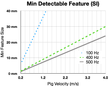 The axial resolution is the smallest feature that the pig can see in the length direction. Sample frequency and pig velocity combine to determine this resolution. This is shown in the graph of Figure 08, where the minimum detectable defect size is plotted against pig velocity for several representative sample rates.