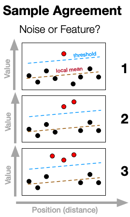 As shown in Figure 09, a solitary reading outside the threshold may represent a small feature, or it may be noise. If there are two consecutive samples with similar values, they may represent a feature, or they may also be noise. After some number of features with similar values outside the threshold, one can have confidence that these locally aberrant signals agree that there IS a feature at this location.